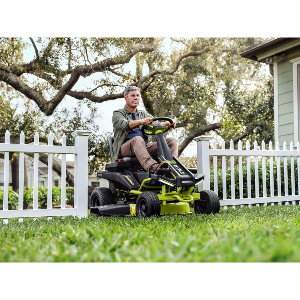 The RYOBI 48-Volt 30 in. Riding Lawn Mower is clean, quiet, and unbelievably powerful. This fully electric mower has no gas and no fumes – just charge and go. It’s powered by 50Ah lead-acid batteries and three high powered brushless motors to give you up to 1 acre or 1 hour of runtime on a single charge. It features two steel blades and durable 30 in. cutting deck that fits in fenced areas with ease. The 7 position manual deck adjustment allows you to choose a heights ranging between 1.5 in. – 4.5 in. to get a clean, level cut on your lawn. The RYOBI 48-Volt Riding Mower is equipped with premium features like LED Headlights, battery level indicator, and a cup holder to make mowing comfortable and convenient. The rear access charging port makes charging your rider easy when the job is done.