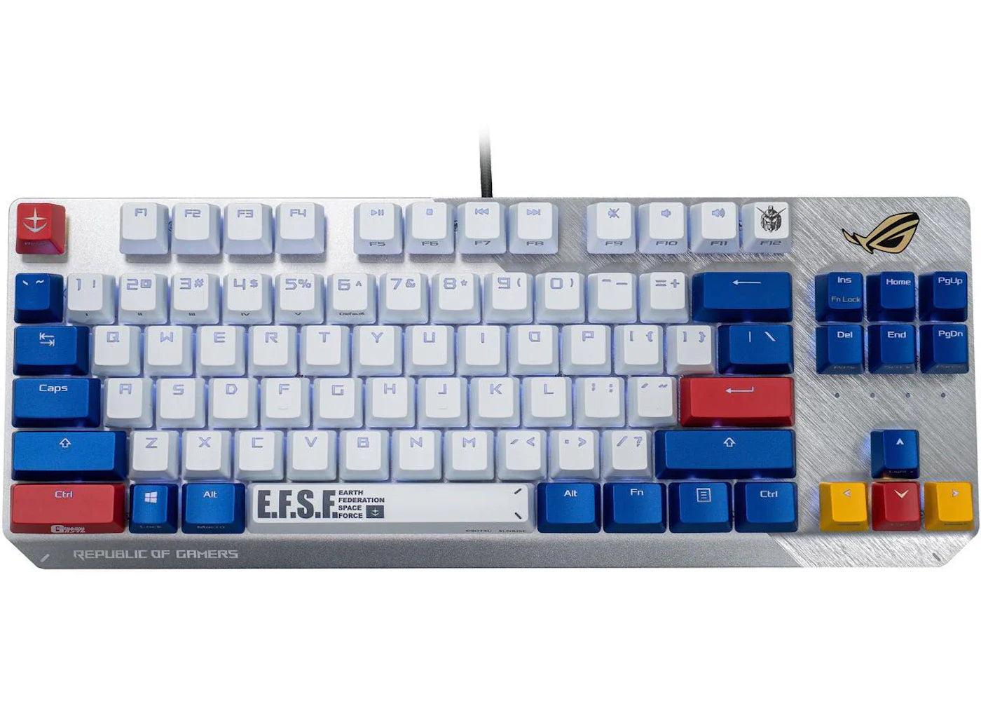 The ASUS Gundam Edition Gaming Keyboard is an Official GUNDAM licensed product. The keyboard features several unique enhancements to improve your gaming experience. It has a tenkeyless form factor to maximize your game setup, an enlarged left Ctrl key, a quick-toggle switch (to instantly shift between function and media key inputs), a stealth key (tapping hides all apps and mute audio for instant privacy; tap again to play on), aluminum top-plate, full RGB illumination, and uses Cherry MX Red switches (German-made, micro-switched actuators for precision input with linear feedback).