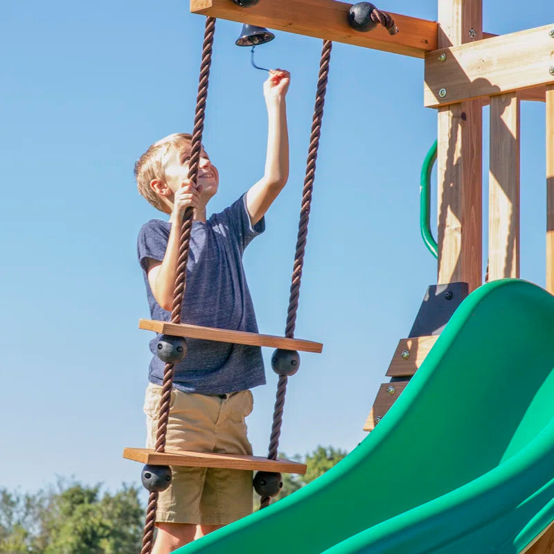 Looking for a heavy-duty swing set to grow with your active kiddos? Calling all climbers out there-this one is for you! The brawny all-cedar Endeavor Swing Set by Backyard Discovery will exhaust even the most energetic offspring! Between the climbing wall, rope ladder, and the double wide rock wall your little mountaineer will improve balance, motor skills, and hand/eye coordination all while building muscle disguised as climbing fun. And when the littles need a break from scaling, they can rest their legs on one of the two belt swings or the large 40” full 360° disc web swing. Sliding down from the 5-foot deck on the zippy 10’ wave slide will have the breeze flowing through their hair and the oversized covered upper deck provides a cool shaded resting spot. With safety at the forefront of Backyard Discovery’s play products, you can rest easy knowing the Endeavor Swing Set meets and exceeds all ASTM standards. Invite the husky Endeavor home and start making memories that last a lifetime!