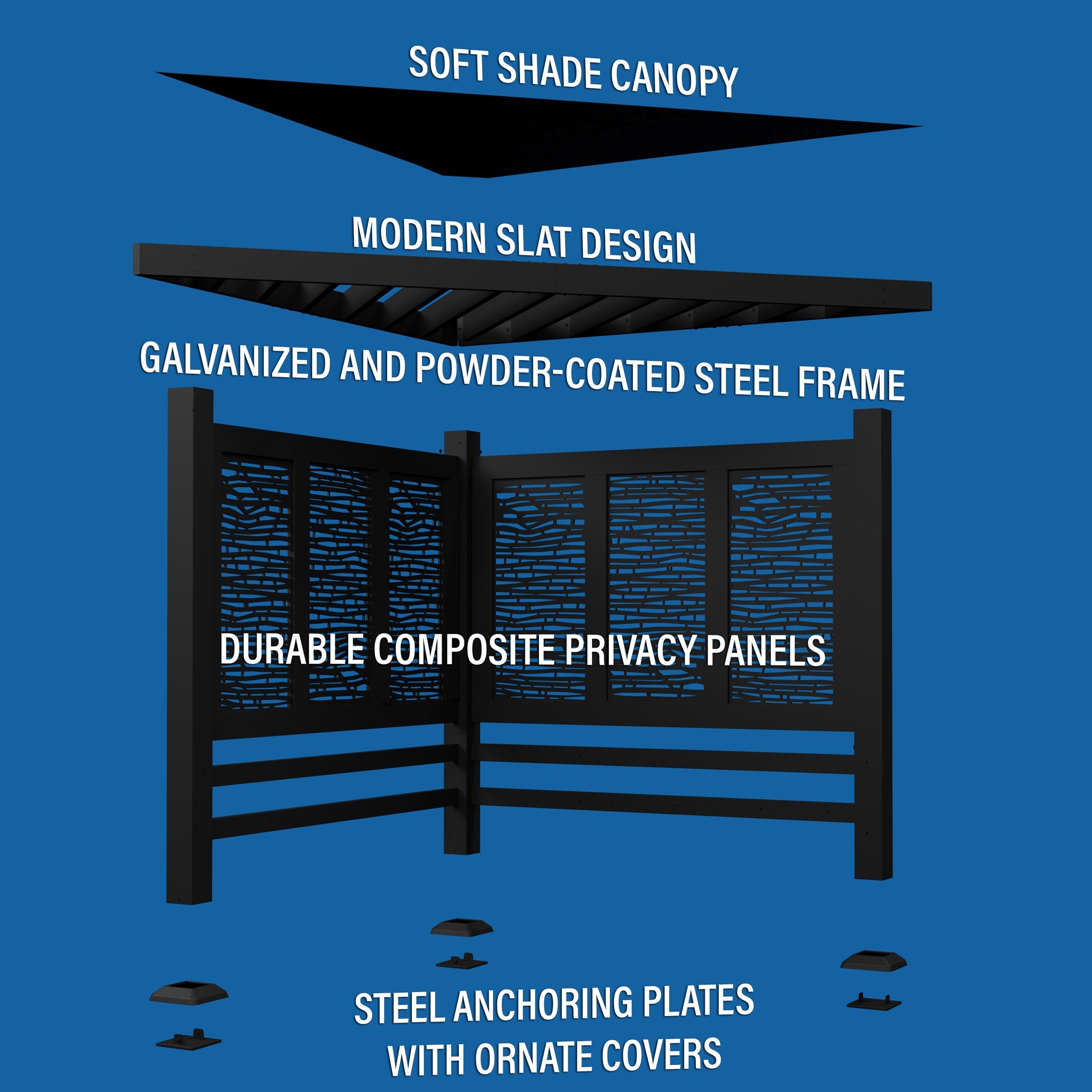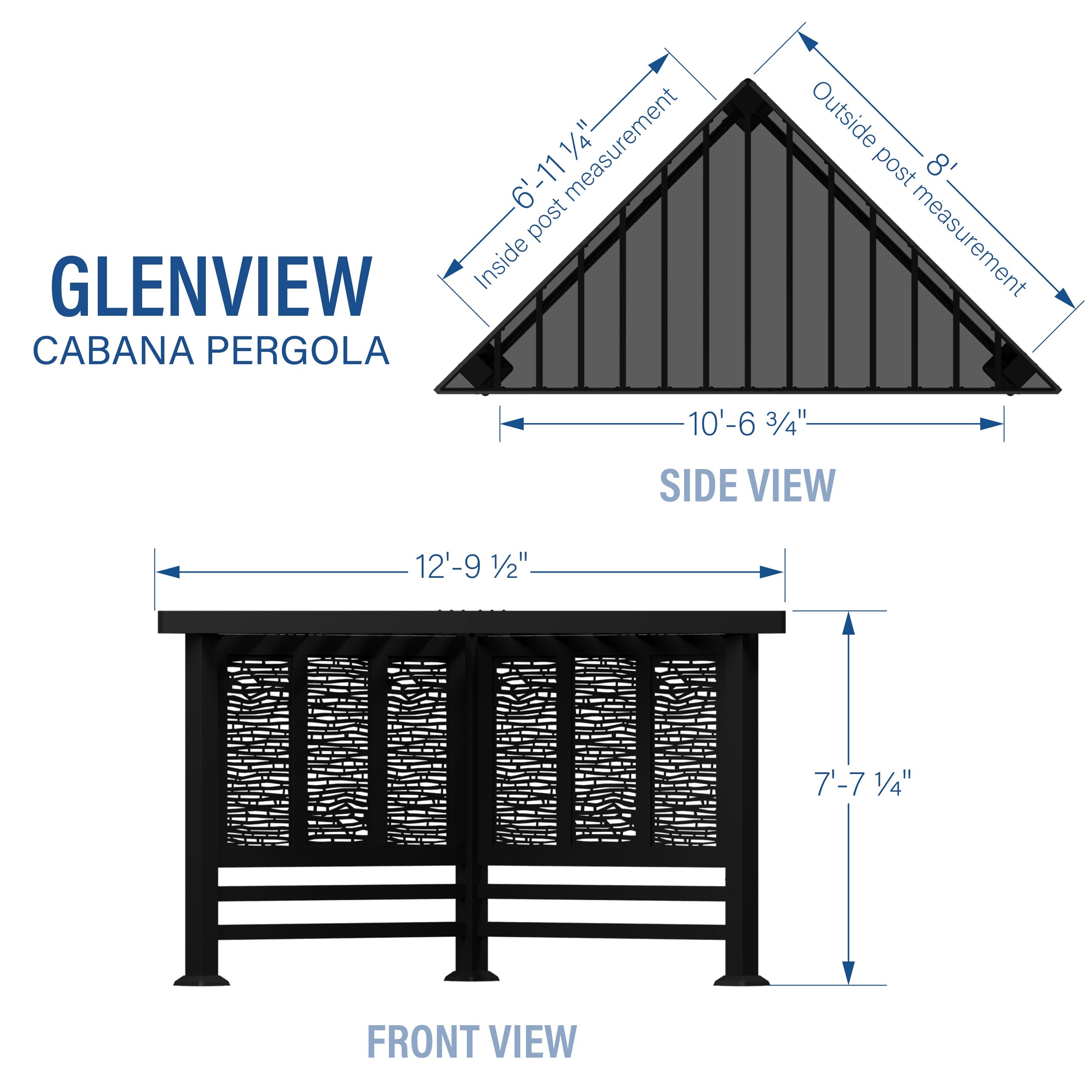 What do you get when maintenance free design and shade meet privacy and flexibility? Cue the Glenview Cabana Pergola by Backyard Discovery! Intended to wow, the unique architecture of the Glenview will beautify any location with its functionality. Whether it be pool or lakeside, fire pit or garden, or even your main patio sectional; the possibilities are endless with the high-performance Glenview Steel Cabana Pergola. Backyard Discovery’s steel product line uses 100% galvanized steel and stainless-steel hardware both powder-coated to fully protect against rust, corrosion, and UV harm. Whether it’s worry-free comfort, relaxation, or entertaining that you’re after, the Glenview Steel Cabana Pergola by Backyard Discovery has you covered!
