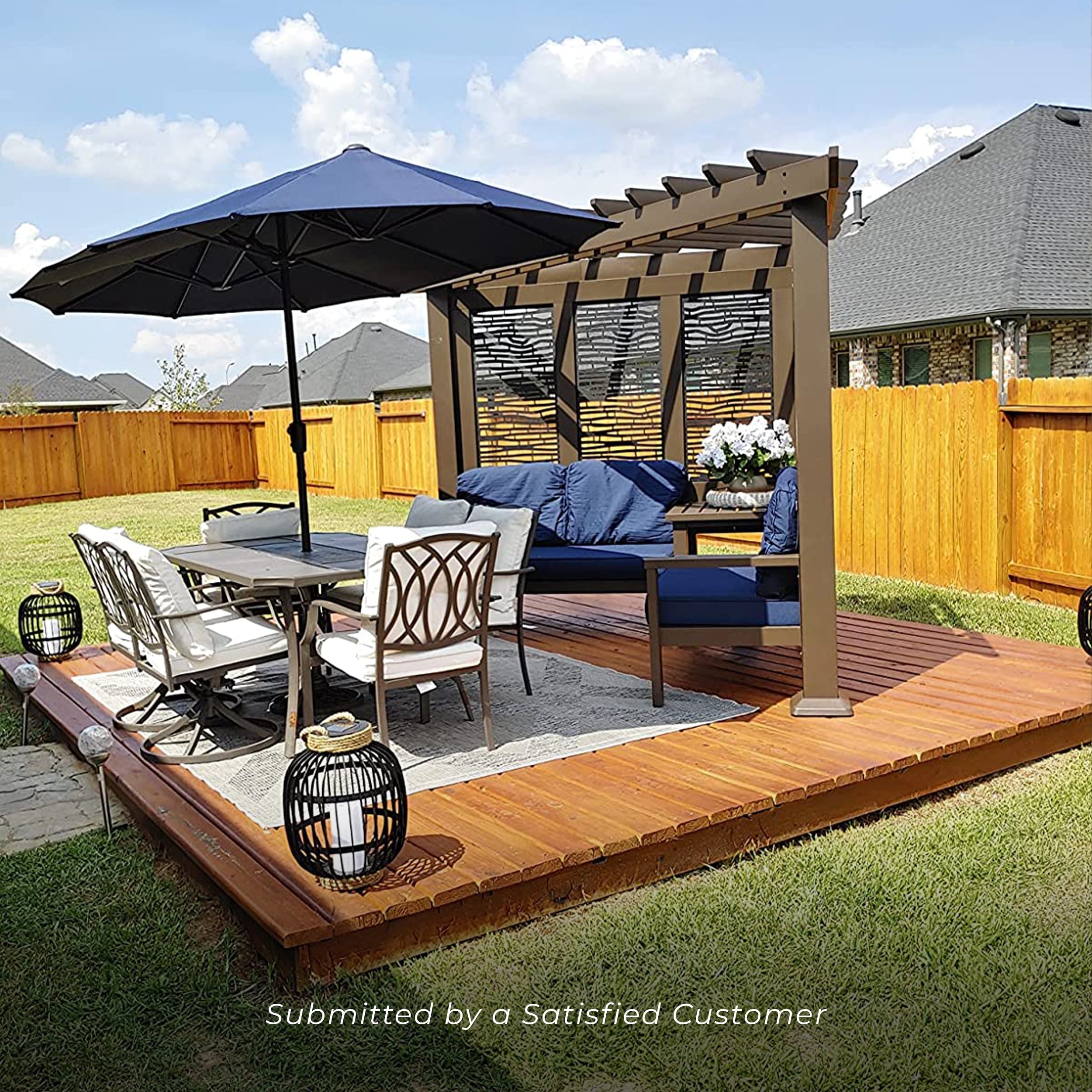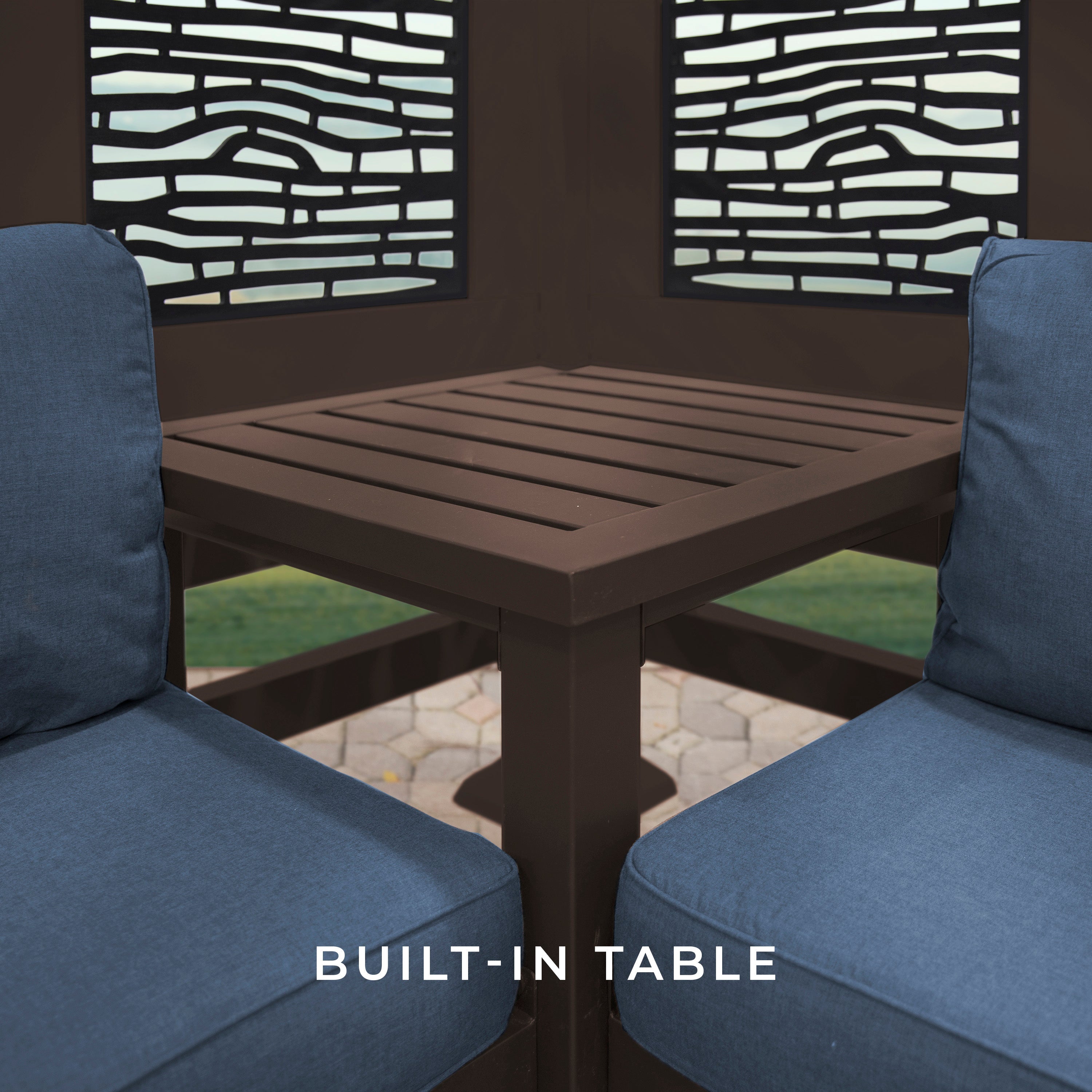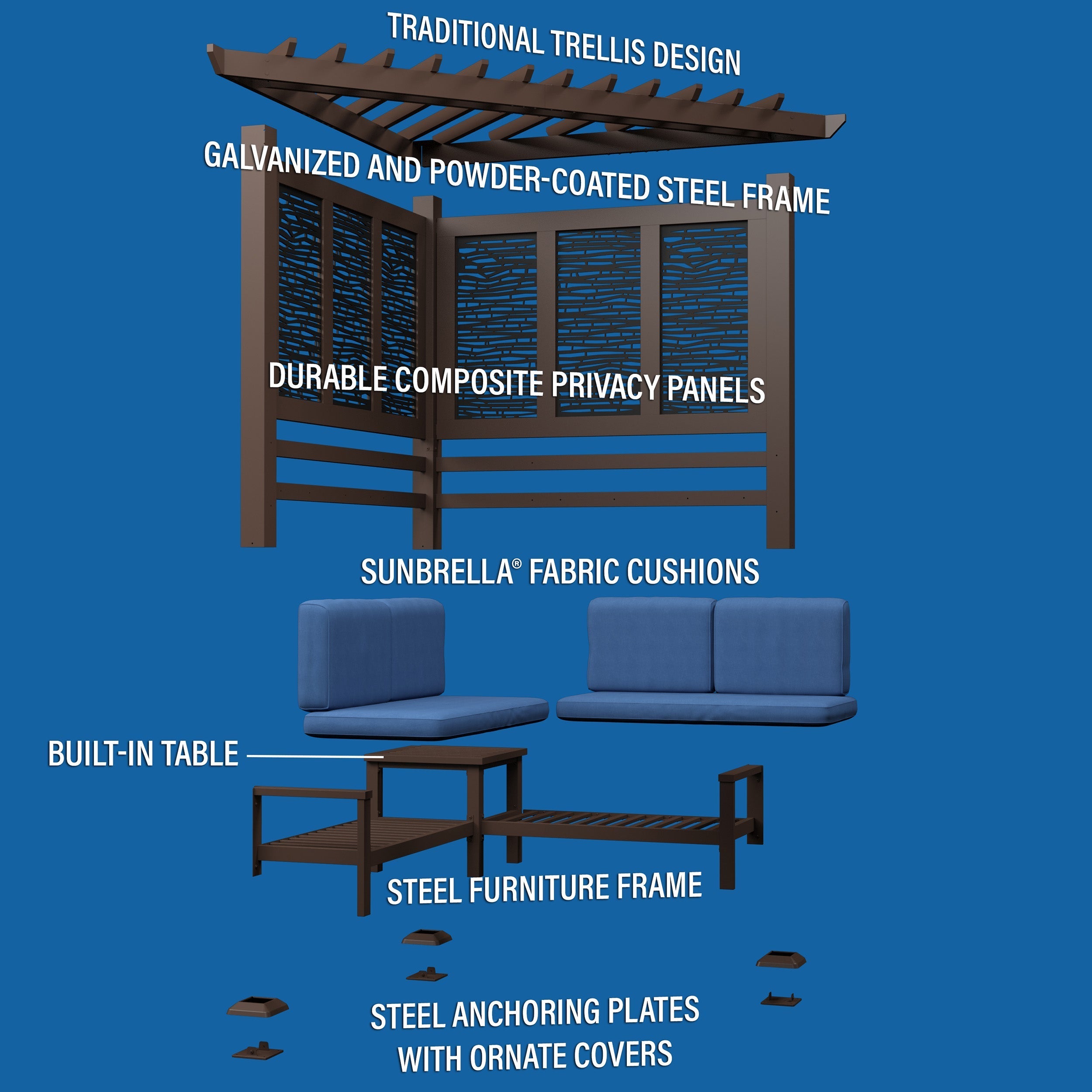 What do you get when maintenance free design and shade meet privacy and flexibility? Cue the Hillsdale Cabana Pergola with patio seating by Backyard Discovery! Constructed from 100% galvanized steel, the Hillsdale cabana pergola includes built-in steel seating with 4 color options of market leading Sunbrella® cushions, as well as an integrated side table and durable composite panels for privacy and shade. Intended to wow, the unique architecture of the Hillsdale will beautify any location with its functionality. Whether it be pool or lakeside, fire pit or garden, or even your main patio sectional; the possibilities are endless with the high-performance Hillsdale Steel Cabana Pergola. Backyard Discovery’s steel product line uses 100% galvanized steel and stainless-steel hardware both powder-coated to fully protect against rust, corrosion and UV harm. Regardless if it’s worry free comfort, relaxation or entertaining that you’re after, the Hillsdale Steel Cabana Pergola by Backyard Discovery has you covered!