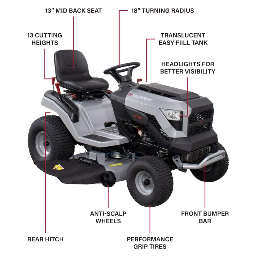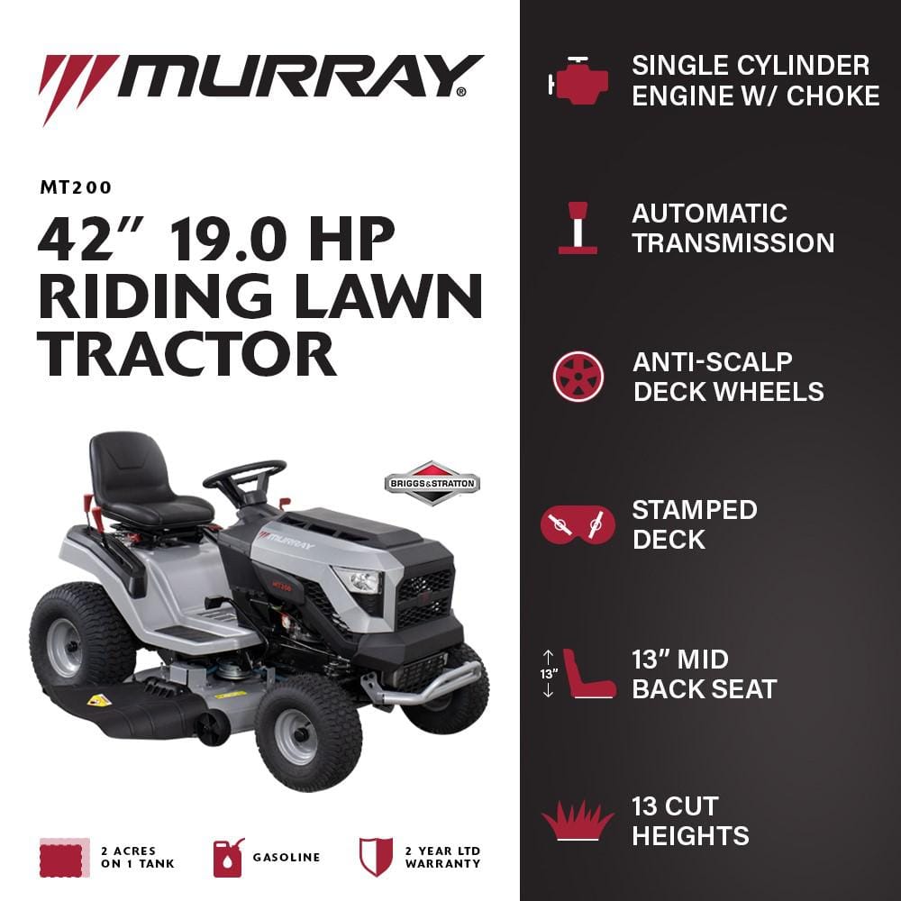Affordable and efficient, Murray products have been getting the job done for over 90-years. Exclusively powered by the world’s leading small engines from Briggs & Stratton, Murray is a perfect fit for today’s consumers who are seeking reliable, high-value products to simplify their busy lifestyles. The Murray MT200 42 in. Riding Lawn Tractor powered by a 19.0 HP 540cc single cylinder Briggs and Stratton Engine delivers powerful performance and a superior cut up to 2 acres on 1 tank of fuel. The adjustable seat has a 13 in. mid-back padded seat for added comfort. Offering an automatic transmission, 13 cutting heights and mow-in-reverse option will allow you to always find the best cut for your grass type. This riding lawn mower also features a cup holder, headlights and a rear built-in hitch for added convenience. Murray. Get it done. Go have fun.