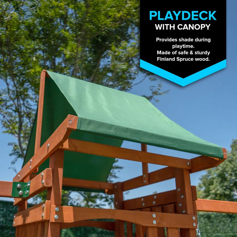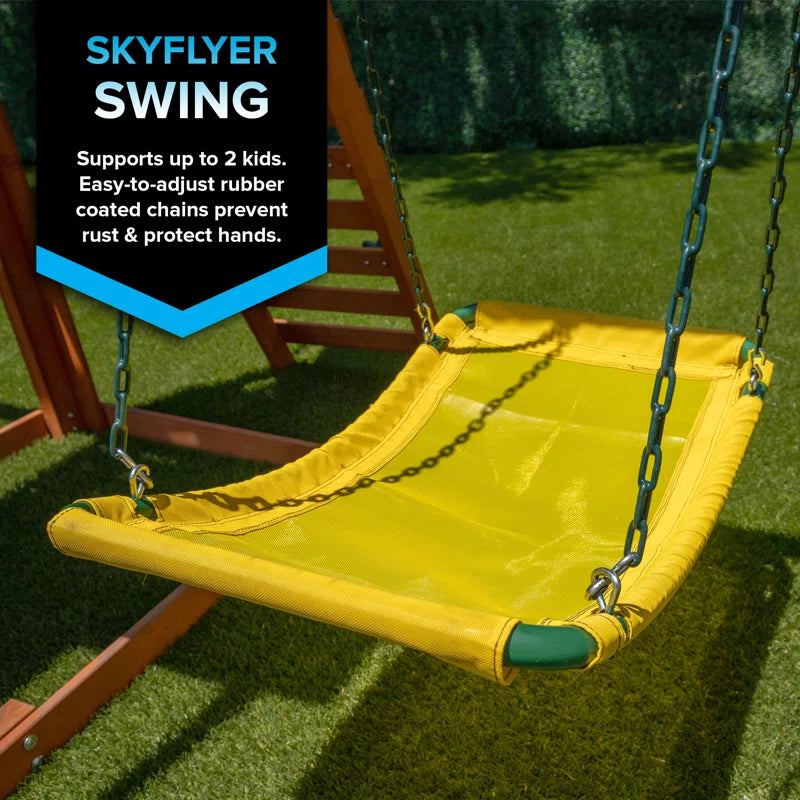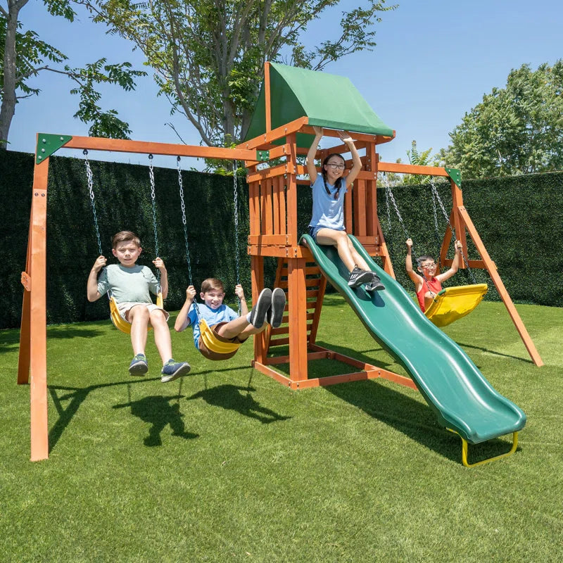 Make your backyard entertainment more fun with the Sportspower Sherwood Wooden Swing Set. This swing set features a classic design with a covered deck and natural wood and green accents for a bright addition to your home’s outdoor area. Vinyl-coated chains prevent your little one’s fingers from getting pinched. This set includes 2 sling-style swings with 1 sky flyer swing that’s designed to hold 2 kids for added fun. Each swing on the set is adjustable to suit all age ranges so it can grow with your children and provide long-lasting entertainment. The swing set also includes a rock climber, sandbox area (sand not included), and wavy slide. Constructed of dense, sustainably-sourced Northern European Scandinavian Wood. This swing set is built to last and can support 6 kids at a time of up to 100 lbs. each. All Sportspower products meet or exceed all ASTM safety standards, so kids and parents can both enjoy the Sherwood Wooden Swing Set with peace of mind.