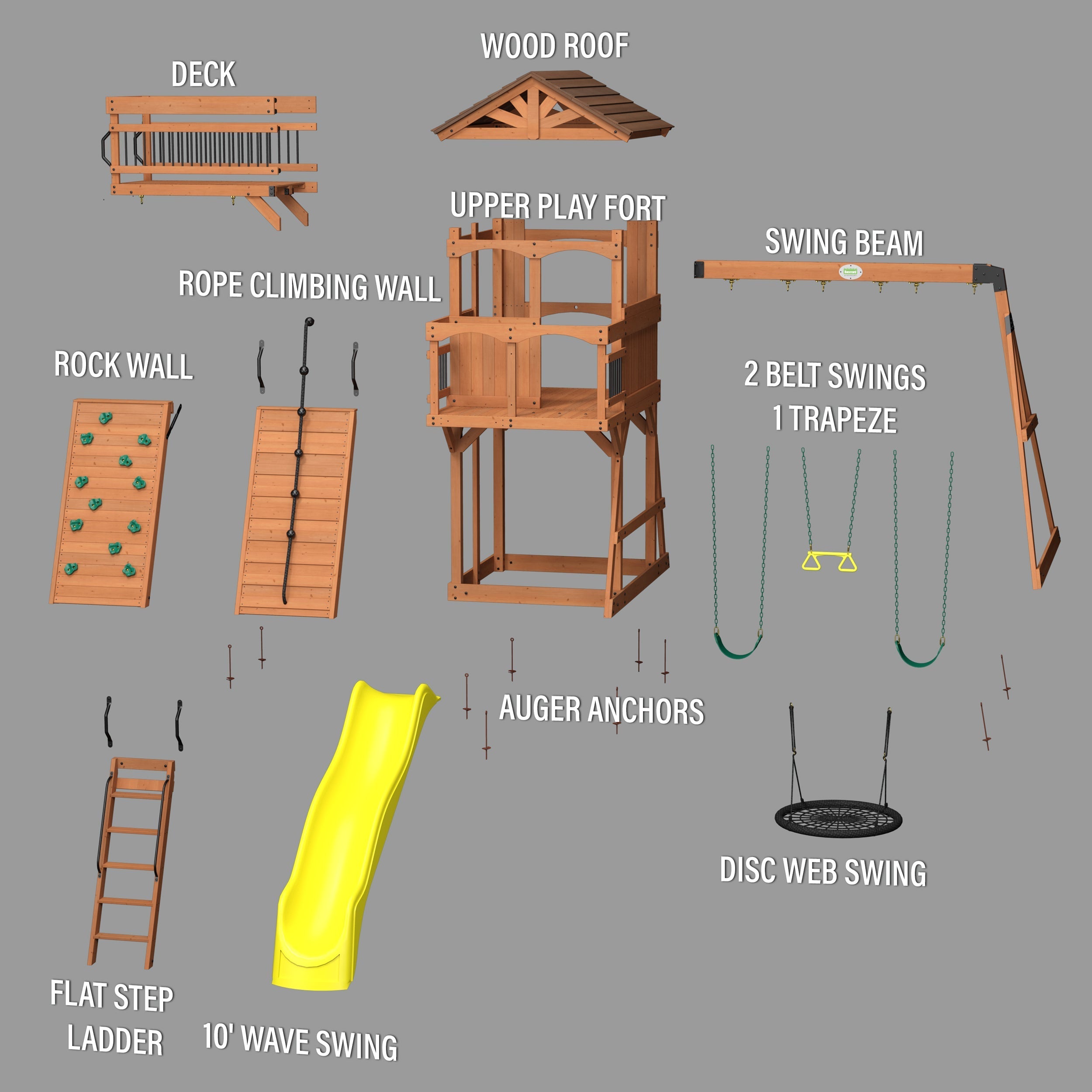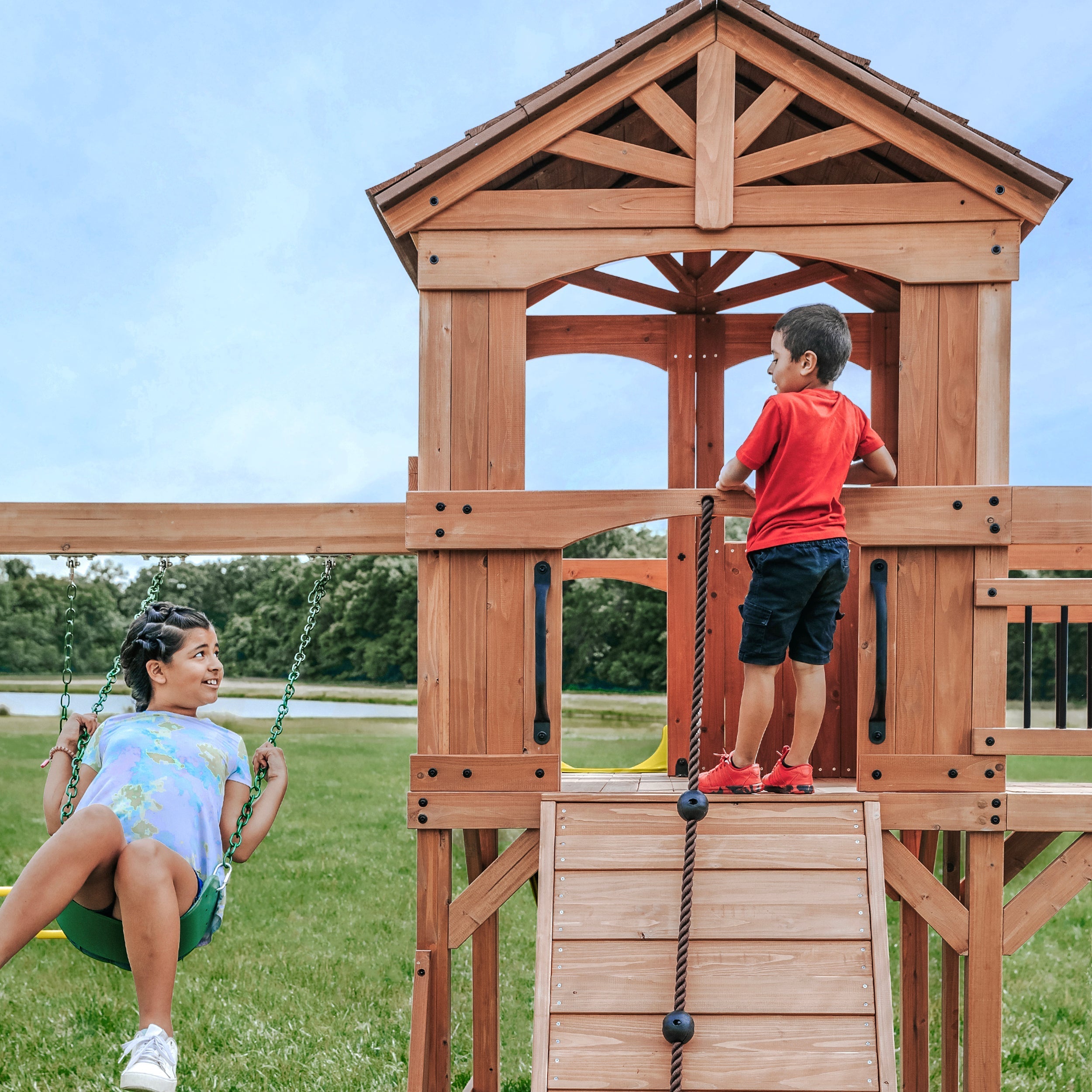 Its striking design with raised clubhouse with a front porch and timber bridge sets the stage for endless play. Kids have three fun ways to access the upper level, they can zip down the wave slide, spin on the 40” disc web swing, or swing to their heart’s content.