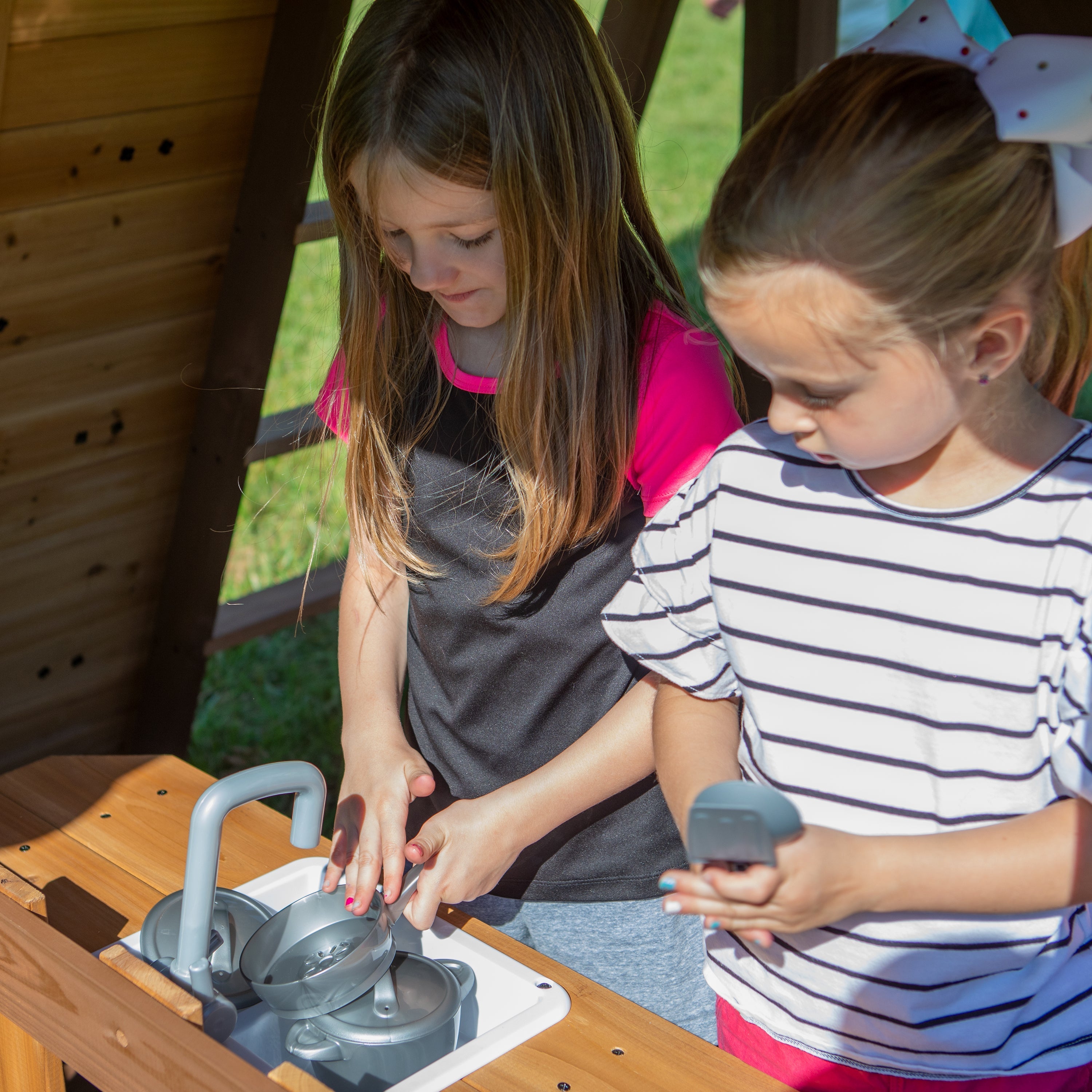 And the sliding is just the start! From the rock wall to the play kitchen with battery-powered accessories, to the chalkboard and the working door, to the disc web swing, there’s an abundance of exciting possibilities!