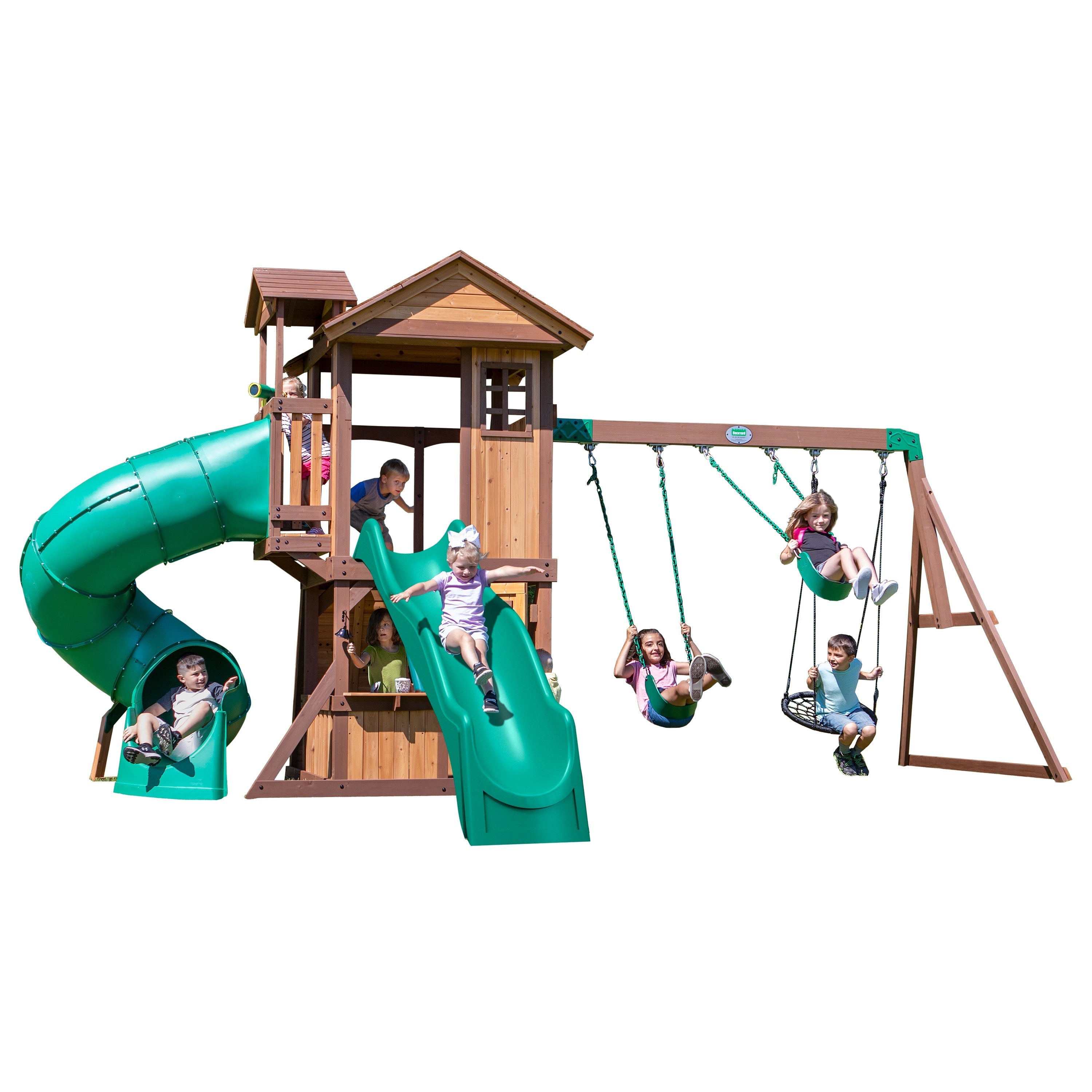 Double the slides and more than double the fun with our Tacoma Falls Swing Set, featuring both a twisting tube slide and 10’ wave slide.