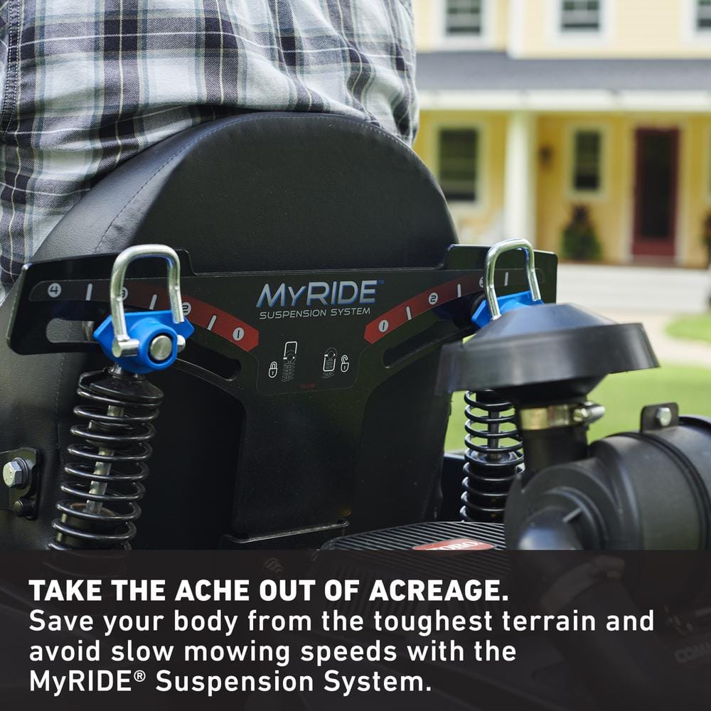 - Patented MyRIDE suspension system features a suspended, fully-floating rear and front shock adjustable operator platform that takes the bumps so your body doesn’t, instead of just relying on a foam seat and tires for cushion, MyRIDE is suspended above the deck for a ride so comfortable, you don’t need to go slow when it gets rough, because we isolate the suspension from the frame, the deck stays level to the ground, giving you a higher quality cut and a more beautiful lawn with MyRIDE, the best seat in the house is actually in the yard