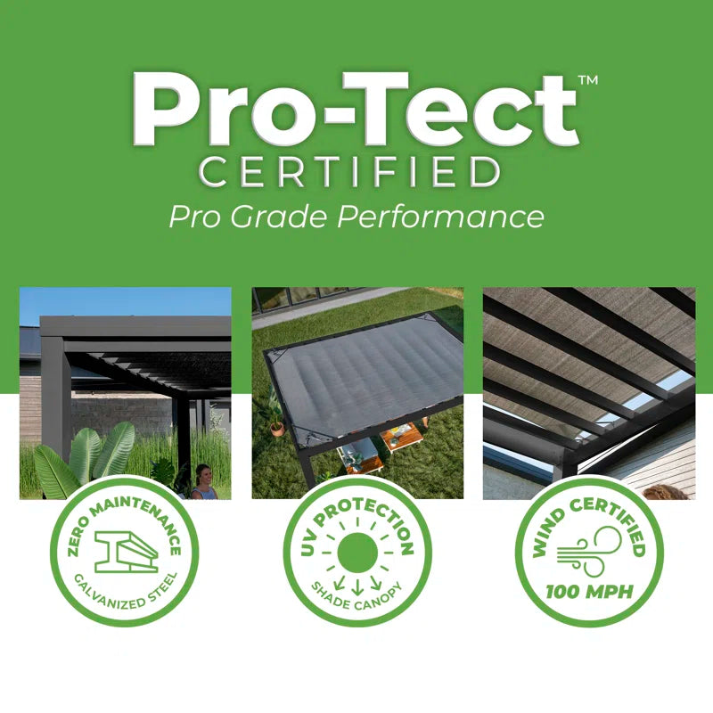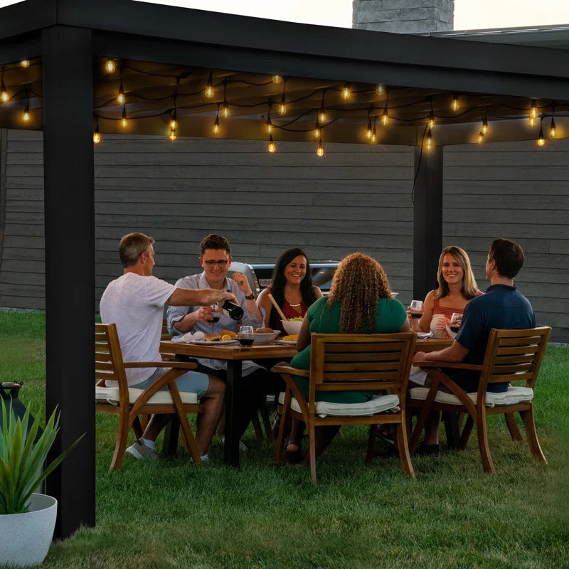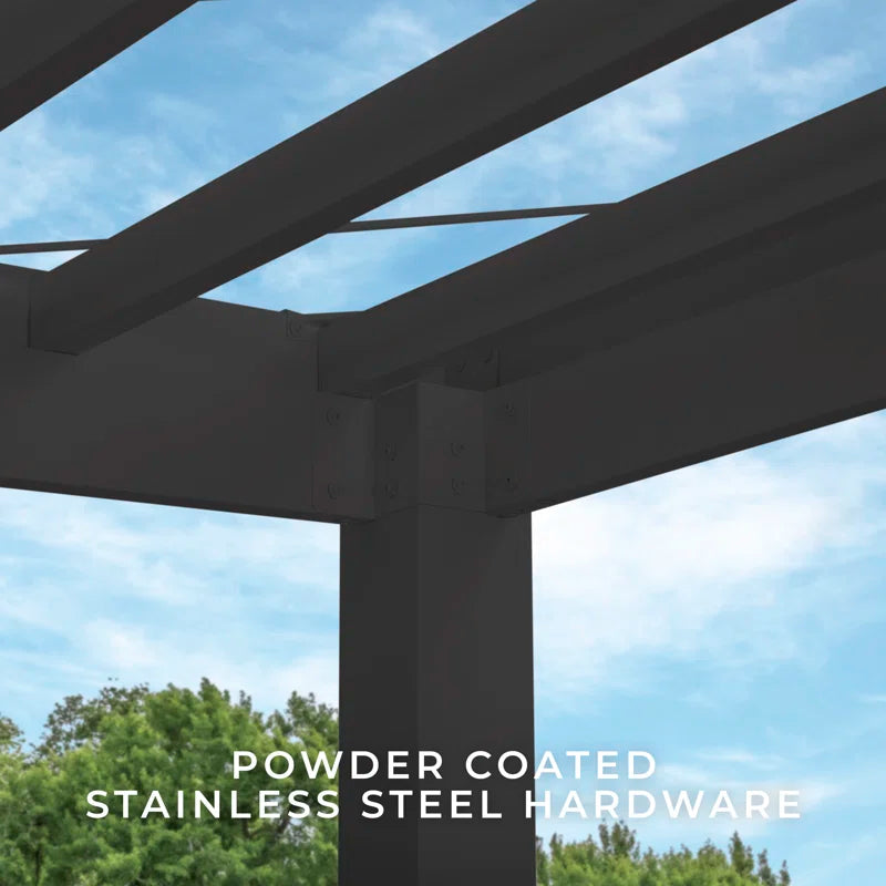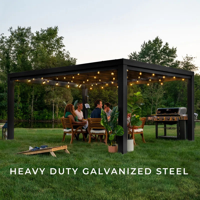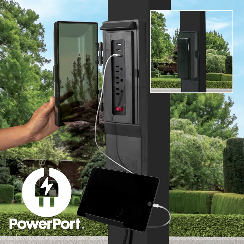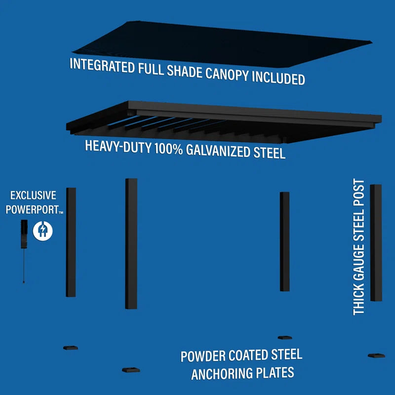 The Trenton steel pergola is Backyard Discovery’s solution to all-weather, all-season functionality, and beauty in a stylish black finish. Our powder-coated, galvanized steel construction makes the Trenton pergola maintenance-free and rust-resistant while offering protection against chipping, scratching, corrosion, and UV harm. With an integrated full-shade canopy included; the Trenton pergola is a minimalist outdoor structure design with a modern, durable steel composition. Our high-quality steel pergolas provide market-leading strength and durability in comparison to aluminum or vinyl outdoor shade products. The Trenton steel pergola provides up to 192 sq. ft. of shade and plenty of room for furniture, fire pits, and entertaining. The exclusive PowerPort has 3 USB ports and 3 electrical outlets to use for powering outdoor lights and electronics as well as charging your devices. If you have been searching for a strong, weather-resistant, modern-styled pergola, look no further. Meet the Trenton galvanized steel pergola by Backyard Discovery!